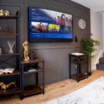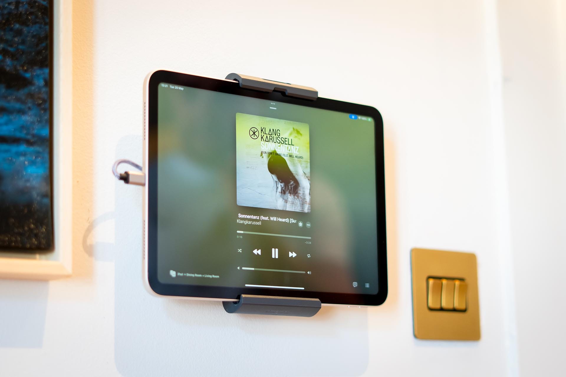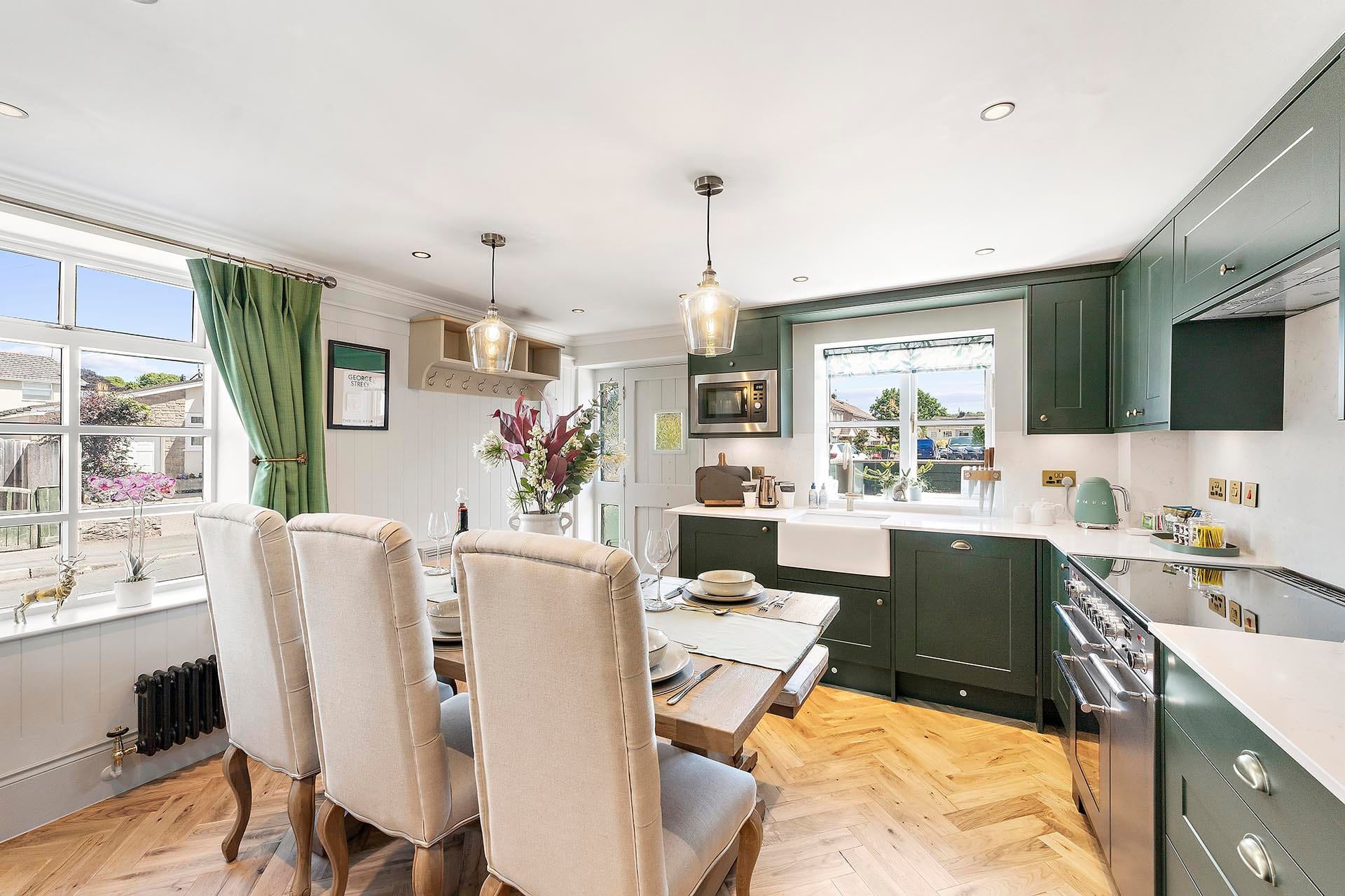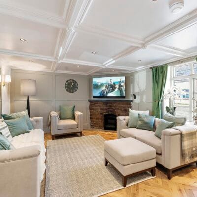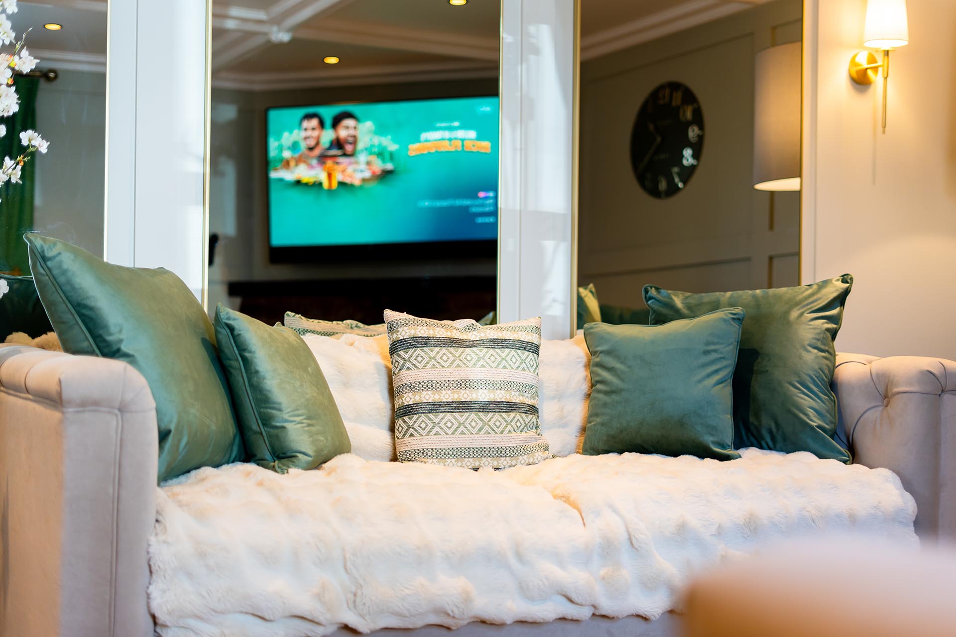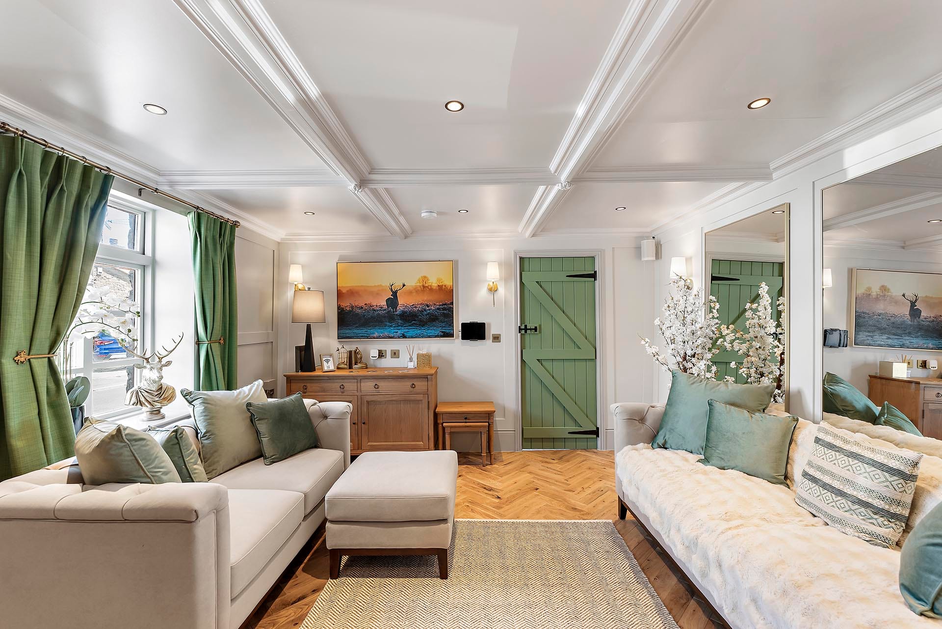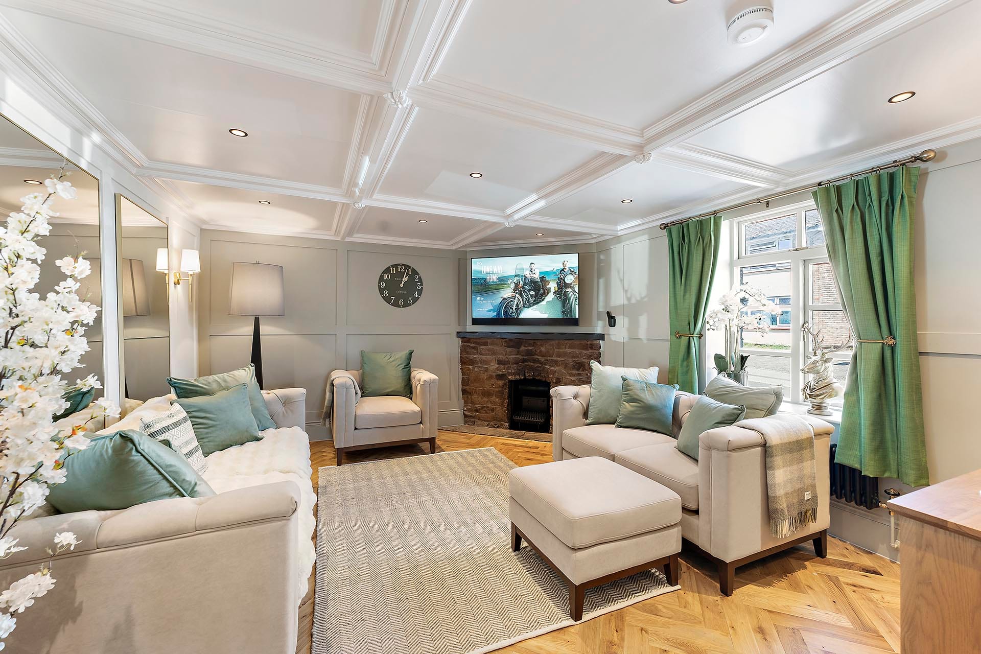 In the Living Room we have a large Sky Glass TV with Sky Movies and Sports included. There is superfast Virgin Media WI-FI throughout the house. SONOS speakers throw music throughout the downstairs and the linked iPad on the wall has Apple Music. Seating for six on the sofas including another two stools provides plenty of options.