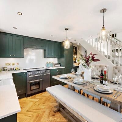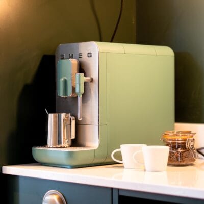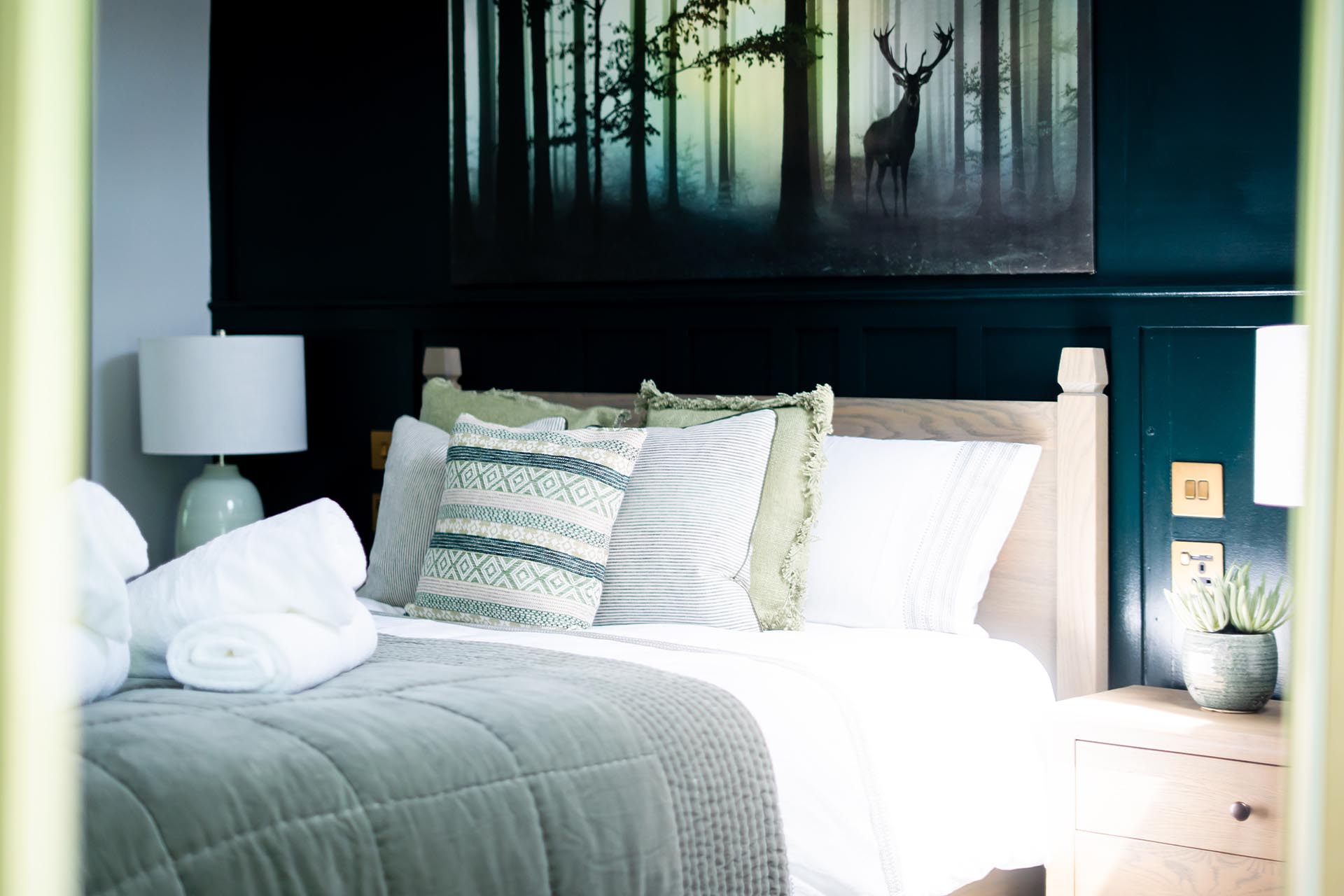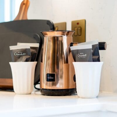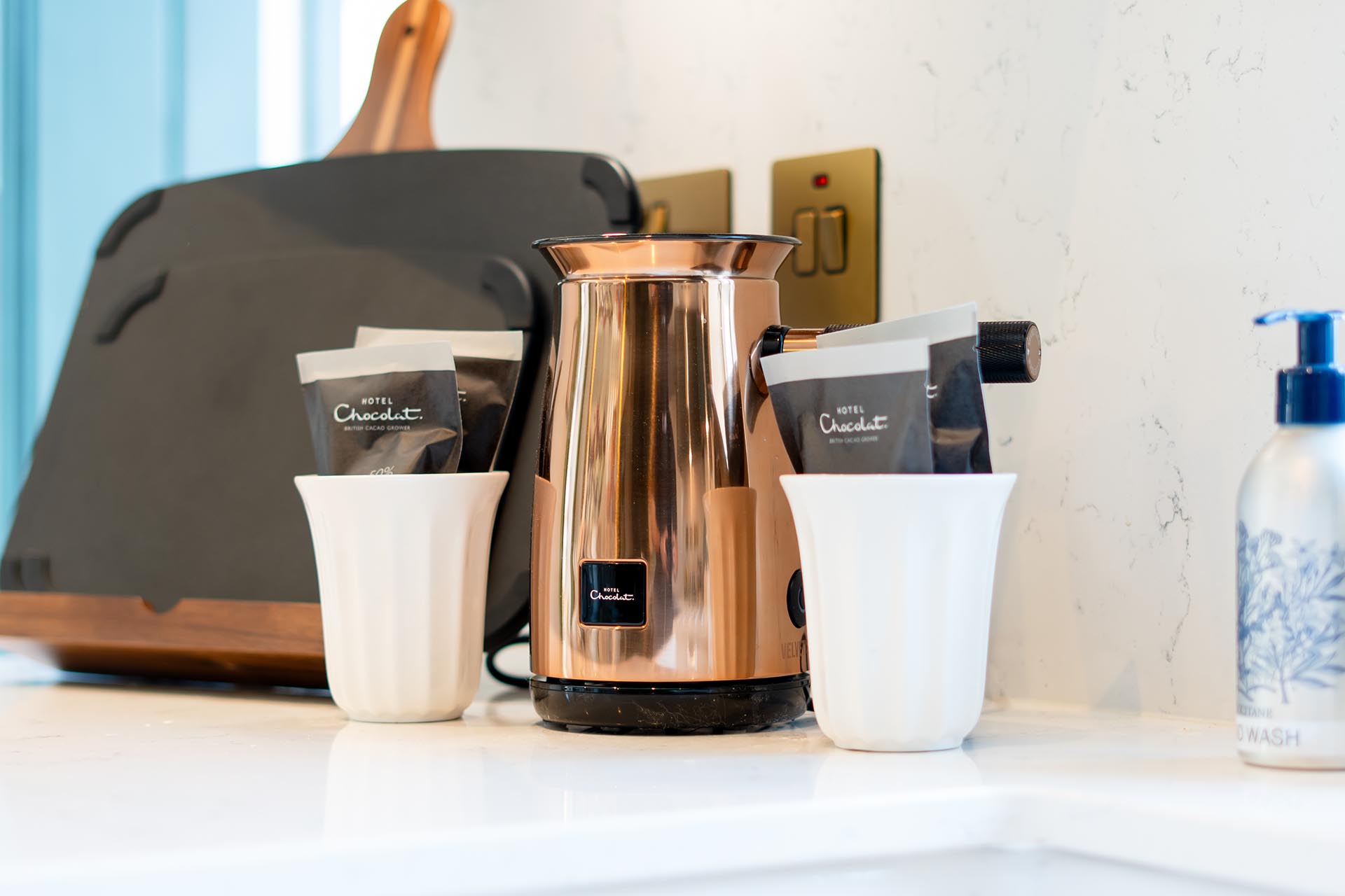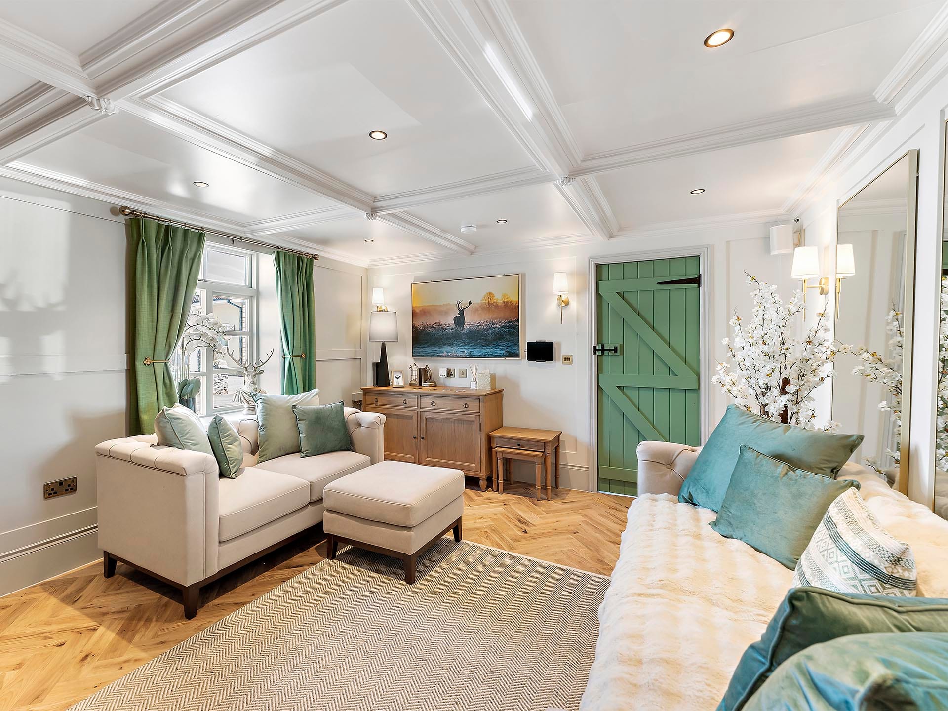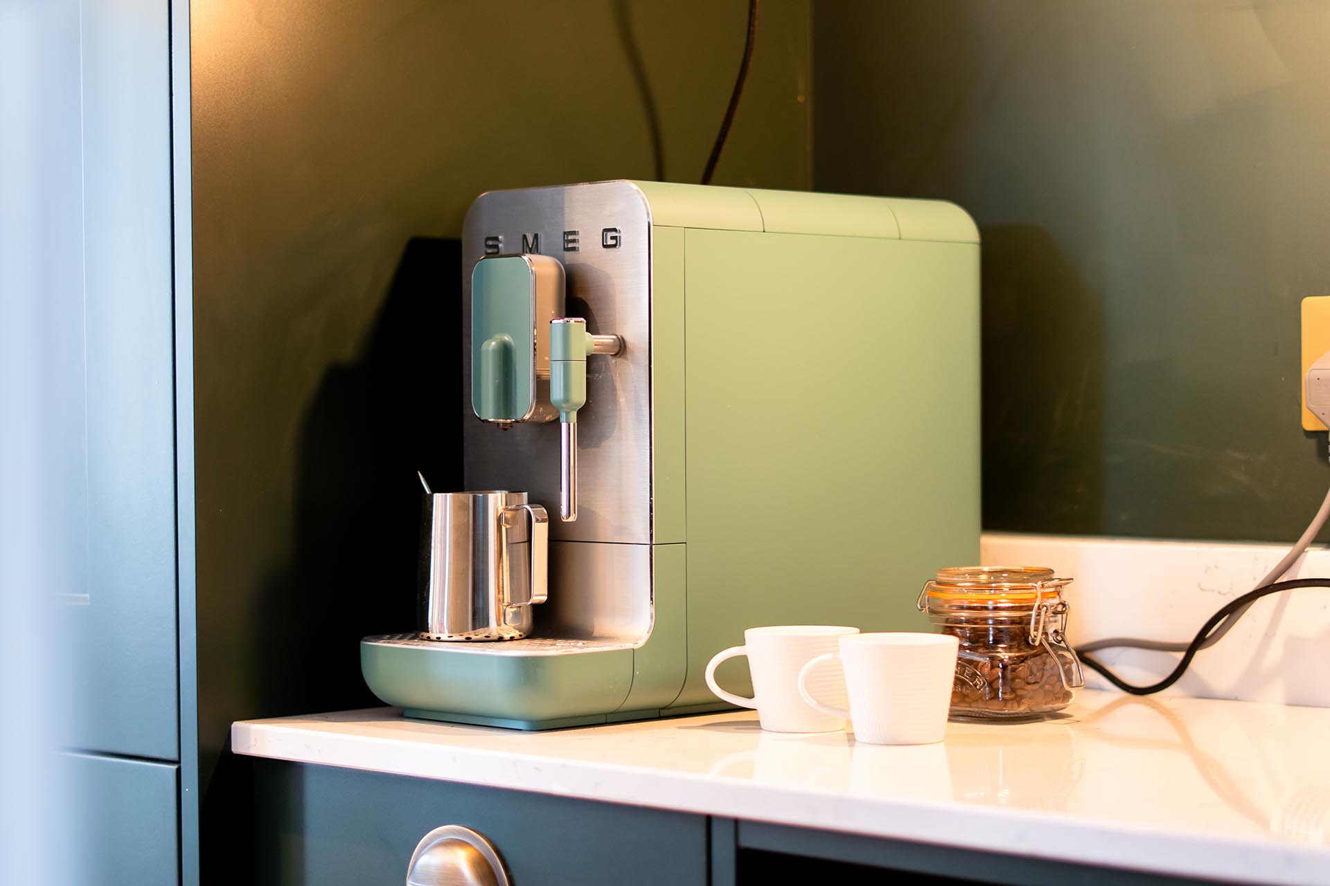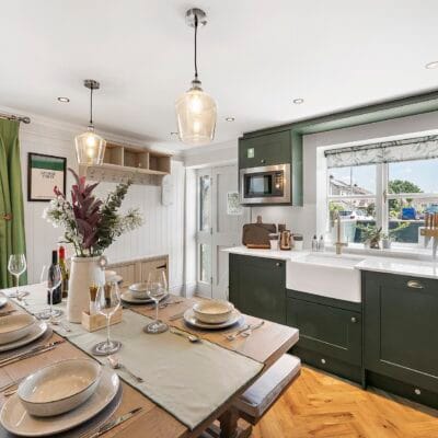 Downstairs the contemporary country inspired Kitchen-Diner has a six ring Rangemaster Electric Aga, Belfast sink, a Hotel Chocolat Velvetiser and Smeg appliances including full bean to cup coffee machine with Lavazza beans. A beautiful solid oak table seats six with a bench seat and solid parquet wooden flooring runs throughout. Complimentary breakfast items are included: milk, bread, biscuits, various jams & spreads, honey, Twinings tea, Taylors coffee bags and Hotel Chocolat sachets. Decaf tea and coffee supplied. We provide a welcome pack to get you started during your stay.