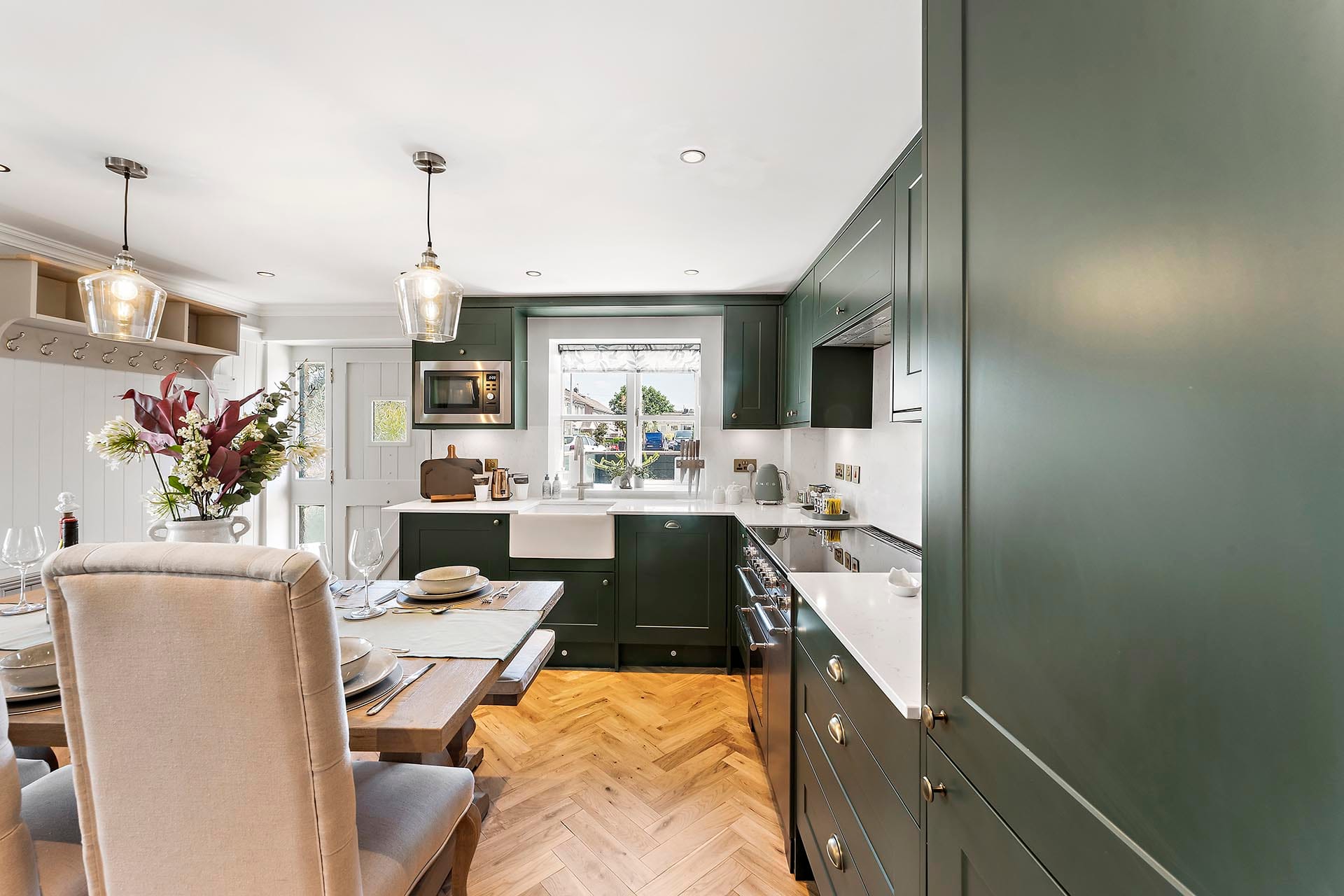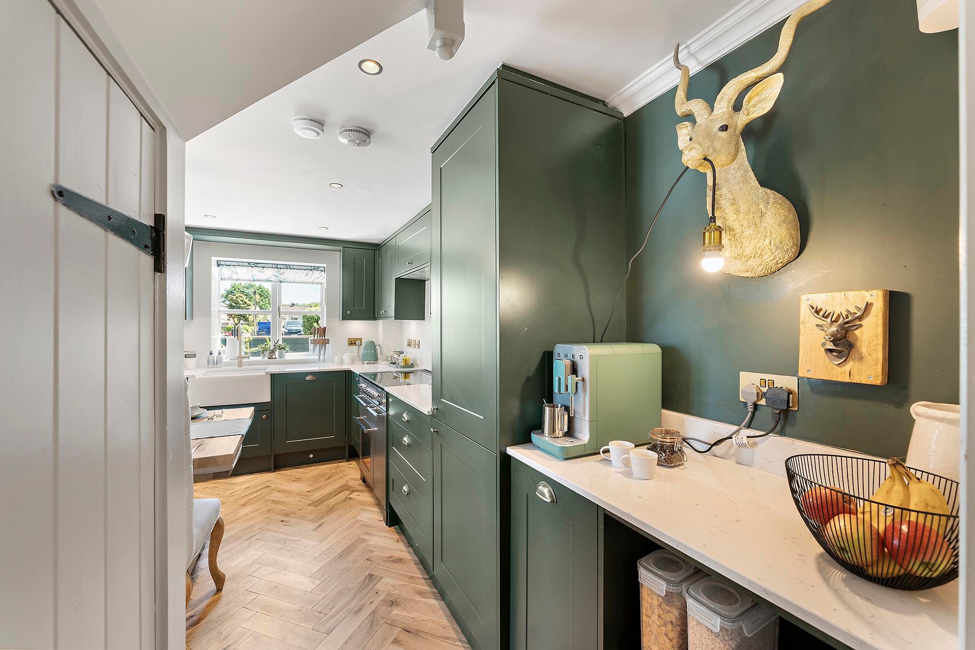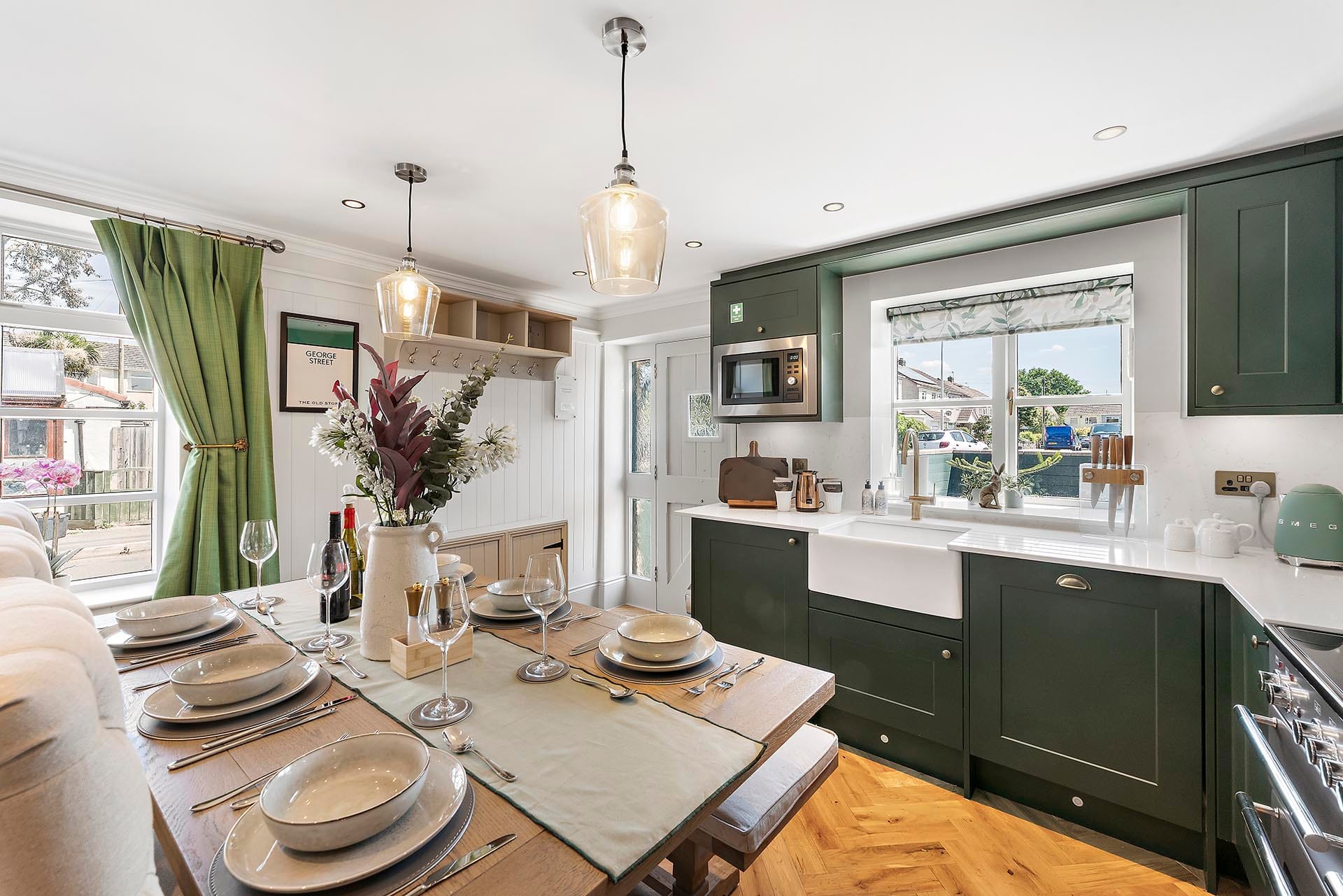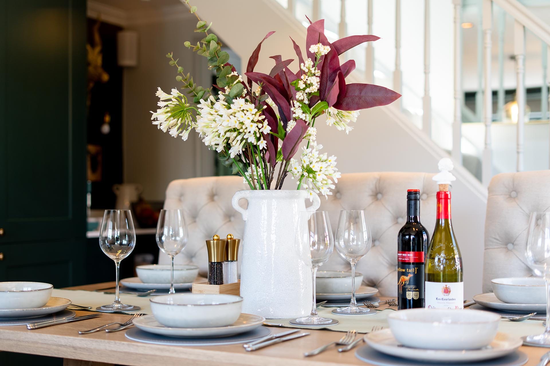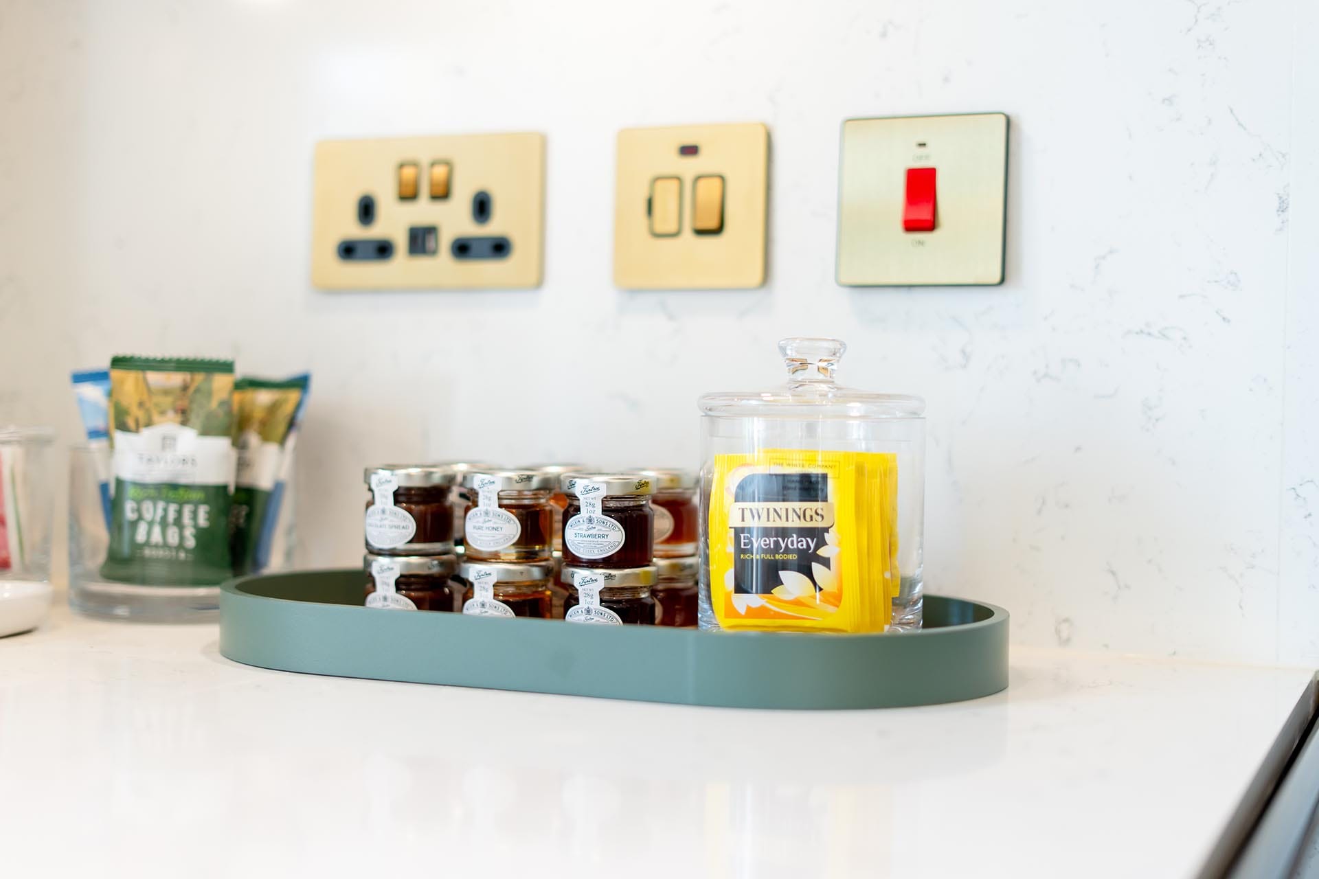 Downstairs the contemporary country inspired Kitchen-Diner has a six ring Rangemaster Electric Aga, Belfast sink, a Hotel Chocolat Velvetiser and Smeg appliances including full bean to cup coffee machine with Lavazza beans. A beautiful solid oak table seats six with a bench seat and solid parquet wooden flooring runs throughout. Complimentary breakfast items are included: milk, bread, biscuits, various jams & spreads, honey, Twinings tea, Taylors coffee bags and Hotel Chocolat sachets. Decaf tea and coffee supplied. We provide a welcome pack to get you started during your stay.