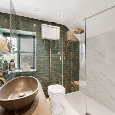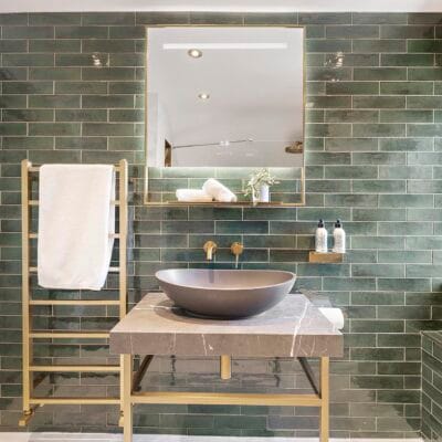 The Bathroom has a powerful walk in waterfall shower, under floor heating, illuminated mirror and complementary L’Occitane cosmetics for your use throughout your stay.